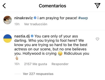 Pero no todo termina ahí, el comentario que más impacto fue realizado por la DJ ucraniana Nastia, quien le escribió en un post a Nina, lo siguiente: “Solo te importa tu culo, cariño. ¿A quién tratas de engañar aquí? Sabemos que te esfuerzas por ser la mejor actriz de nuestra escena, pero nadie te cree. Hollywood está llorando. Eres ridícula.”