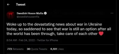 Artistas como las ucranianas Nastia y Miss Monique, Swedish House Mafia, The Chainsmokers, Joseph Capriati y Layton Giordani han condenado las acciones de Rusia en Twitter.