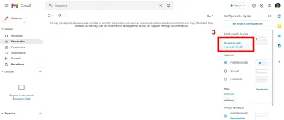 Para poder probar este diseño y tenerlo disponible, dirígete a la sección de configuraciones, y en la primera opción, has clic sobre "prueba la nueva vista de Gmail". Posteriormente, recarga la página y el nuevo diseño sé encontrará disponible.